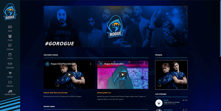Without any placement of merch apart from being the homepage and left side navigation, there is little to no reason to use Rogue’s website and Rogue’s management isn’t worried about that. There is little unique content which couldn’t be found on another esports news site about the team or on their social media. I can’t even find out when their next matches would have been on as their events page spans back to 2018. This site appears to be an afterthought and their main focus seems to be the colour palette.